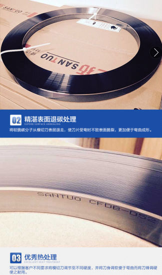 Порез звон  и правило Creasing 1. Применение Стальное режущее правило для производителей штампов, штампов, штампов, штампов и картонной фабрики. 2. Доступные типы Правило вырезания, правило сгибания, правила перфорации, правила волн, правило вырезания и сгибания. Режущие инструменты с ЧПУ Режущие инструменты с ЧПУ 3. Технические характеристики Thicknesses-- (2PT) 0.71mm,  (3PT) 1 .07mm, (4PT) 1.42mm Высота---------- 22-23,8 мм и 30 мм, 50 мм, 60 мм, 80 мм Твердость ------ тела ( 38-45HRC) Угол края  (42/52) Форма ----- центральная скос, длинный скос, боковой скос, длинный боковой конус (CB, LCB, SB, LSB) Скос: центральная фаска или длинный скос Упаковка: Катушка или полоса для по часовой или против часовой стрелки Высокочастотная закалка